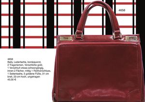 Bally Ledertache, bordeauxrot, 2 Trageriemen, Verschlüße gold, 1 Verschluß etwas schwergängig, innen 2 Fächer, mittig 1 Reißverschluss, 1 Seitentashe, 5 goldene Füße, 31 cm breit, 23 cm hoch, ungetragen