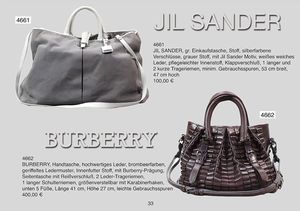 JIL SANDER gr. Einkaufstasche, Stoff, silberfarbene Verschlüße, grauer Stoff, mit Jil Sander Motiv, weißes weiches Leder, pflegeleichter Innenstoff, Klappverschluß, 1 langer und 2 kurze Trageriemen, minim. Gebrauchsspuren, 53 cm breit, 47 cm hoch