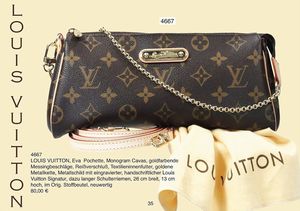 LOUIS VUITTON Eva Pochette, Monogram Cavas, goldfarbende Messingbeschläge, Reißverschluss, Textilieninnenfutter, goldene Metallkette, Metallschild mit eingravierter, handschriftlicher Louis Vuitton Signatur, dazu langer Schulterriemen, 26 cm breit, 13 cm hoch, im Orig. Stoffbeutel, neuwertig