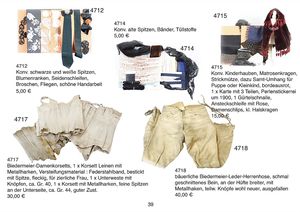 Konv. Biedermeier-Damenkorsetts, 1 x Koresett Leinen mit Metallharken, Versteifungsmaterial : Federstahlband, bestickt mit Spitze, fleckig, für zierliche Frau, 1 x Unterweste mit Knöpfen, ca. Gr. 40, 1 x Korsett mit mit Metallharken, feine Spitzen an der Unterseite, ca, Gr. 44, guter Zust