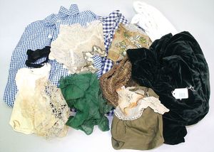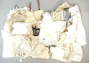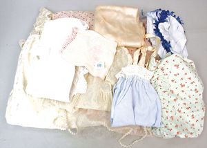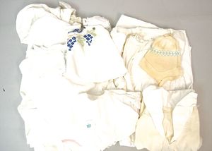 Konv. alte Kinderkleidung, darunter ein wattierter Umhang, bestickt, Hemd mit Hose, Kleid, Mütze, 1 Kleid filigran bestickt, Damenunterrock, kl. Puppensteckkissen