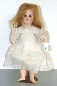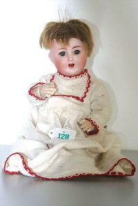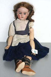 Porzellankopf-Puppe, gemarkt 5, Brandlinie am Hinterkopf, braune Schlafaugen, off. Mund, Zähne, Kunsthaarperücke aufgeklebt, auf Masse-Gliederkörper, Farbabrieb an den Fingerspitzen, 45 cm