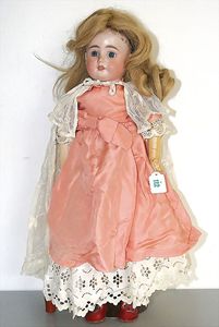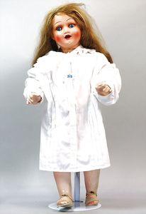 Porzellankopf-Puppe gemarkt 3, blaue, fest eingesetzte Glasaugen, off. Mund, Zähne durchst. Ohren, Echthaarperücke, auf Masse-Stehkörper, Kopf und Körper nicht zueinander passend, 50 cm, Farbabrieb an den Händen, Wachstuch-Schuhe