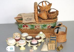 Konv. Körbe, Deckelkorb, Länge 23 cm, Höhe 12 cm, 6 kl. Körbe, dazu einige Gerichte, Torten auf Holzsockel für eine Konditorei, einige Papiertüten und Schachteln