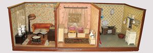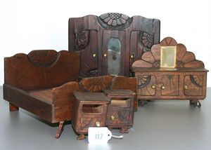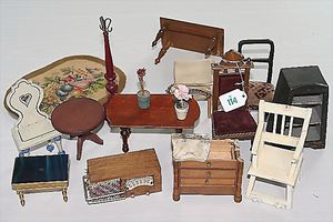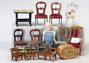 Konv. versch. Puppenstuben-Mobiliar, Stühle, Tische (Gründerzeit), Flaschenbord, Kommode u.v.m.