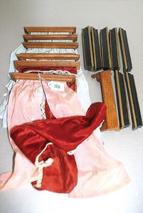 Konv. Puppenstuben-Gardinenstangen, Holz, mit je 2 Ösen, Länge 14 cm, teilw. mit Vorhängen