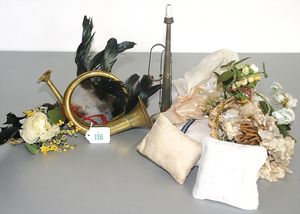 Fundkiste, ein paar Puppenhäubchen, 2 Kindertrompeten, 3 Haarnadeln, einige Stoffblüten zum Anstecken, bzw. Haarkränze