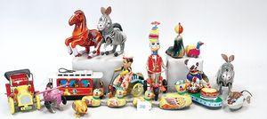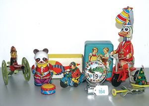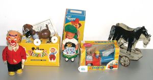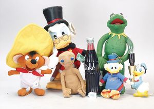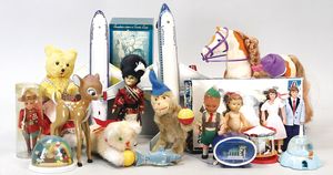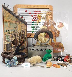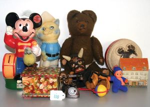 Fundkiste, Vinyl-Mickey-Mouse-Spardose, kl. Mickey-Mouse-Spielball, Teufel-Puppe, STEIFF Wollvogel mit Drahtfüßen, kl. Spieluhr, Teddybär Kunstplüsch, Hersteller? u. a.