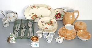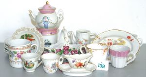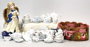 Konv. Puppenstuben-Porzellan, Einzelteile, versch. Dekore, Teller, Tassen, Kannen, 5 passende Teller mit Platte, gemarkt Hamage Nord