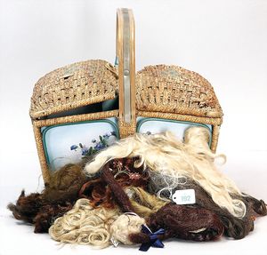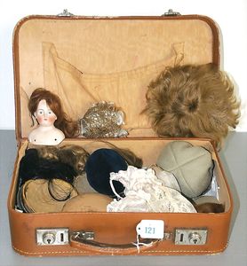 Konv. 5 Puppen-Perücken, Mohair, Echthaar und Kunsthaar, dazu Porzellan-Brustblattkopf, gemarkt 12 und einige Kopfdeckel, versch. Größen