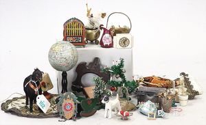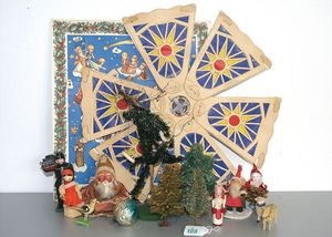 Konv. Weihnachtsdeko, Papierlaterne, Weihnachtsfiguren Holz, wohl ERZGEBIRGE, kl. Schafe, Puppenstuben-Tannenbaum, ca. 22 cm, u. a.
