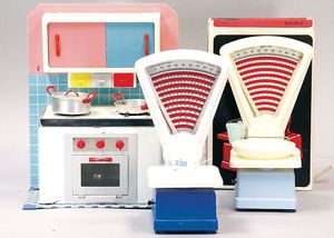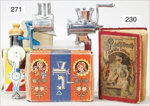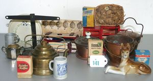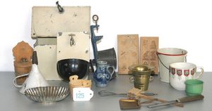 schönes Konv. Puppenküchenzubehör, Fleischwolf, Blecheimer, Keramikkrüge, Förmchen, dazu 2 Wasserkasten für Puppenküche, Waschbecken, Blech, mit Hahn