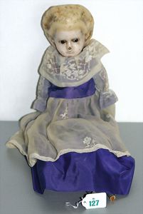 Masse-Brustblattkopf-Puppe, Wachs überzogen, braune eingesetzte Glasaugen, Farbabrieb an Nasenspitze, Oberlippe und Kinn, Stoffkörper, Holz-Arme und -Unterschenkel, 1 Fuß fehlt, 45 cm, Kleidung nachgenäht