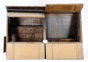 Kaufladenstand zum Aufklappen, mit einigen Schubladen, Länge 60 cm, Breite 25 cm, Höhe 40 cm, mit seitl. Tür, wohl Bastelarbeit