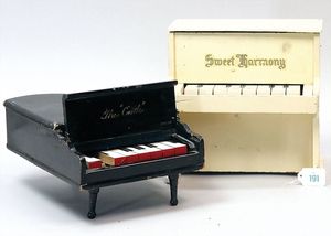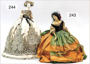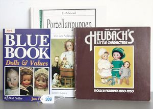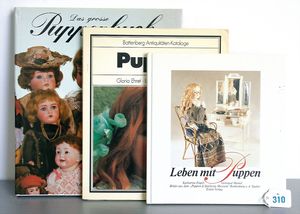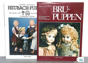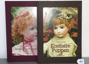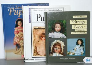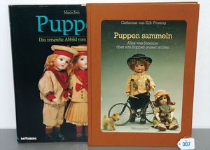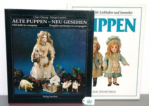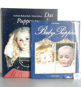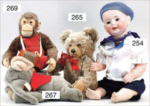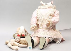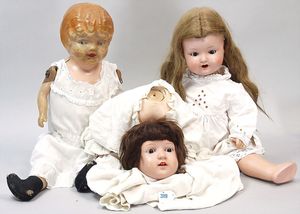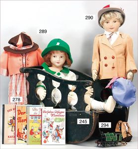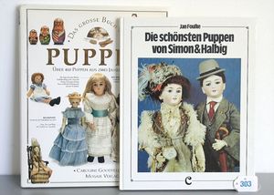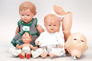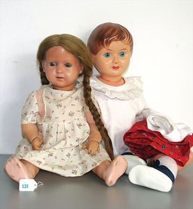Konv. 2 Puppen, SCHILDKRÖT Mädchen, gemarkt SiR 18, blaue Schlafaugen, off. Mund, Zähne, Echthaarperücke, Riss über der rechten Wange, auf Masse-Stehkörper, mit Laufmechanismus, 50 cm, dazu Kunststoff-Puppe, gemarkt FWF, gemalte Augen, geprägte Haare, Beine liegen lose bei, ca. 56 cm