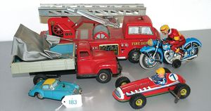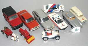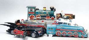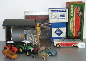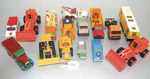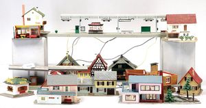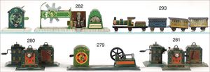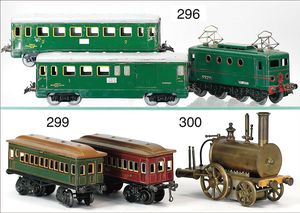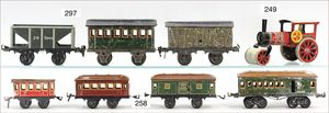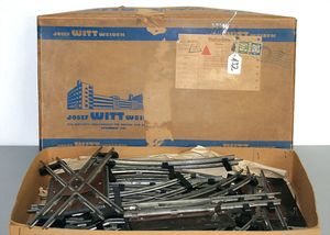 Großes Konv. Gleismaterial, Spur 0, Uhrwerk elektr. betrieben, dazu Brücke, 3-teilig, Blech lithogr., kl. E-Lok H0 Nr. V 36257