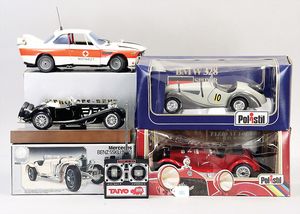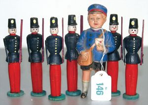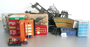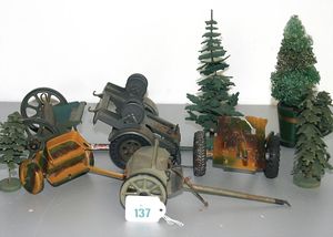 Konv. wohl MÄRKLIN, Kanonen und Gestelle, Blech, Ersatzteilspender, dazu einige Bäume, Papiermaché
