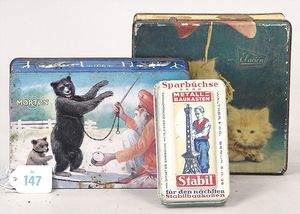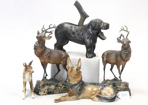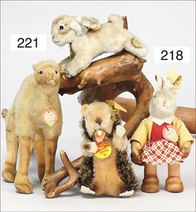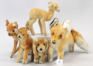 STEIFF Konv. 5 Teile, 3 x Bambi, Dackel, Fuchs, alles stärker bespielt, ohne Knopf, Schild und Fahne