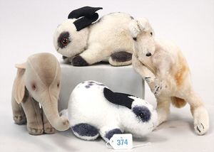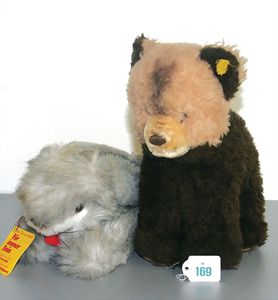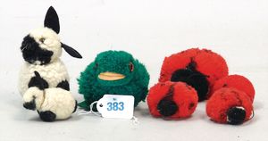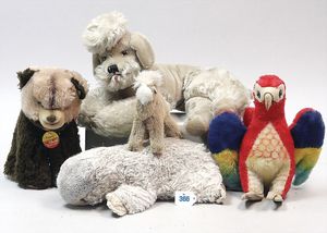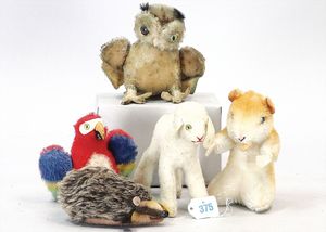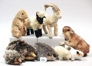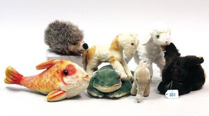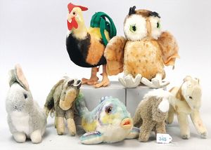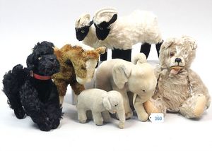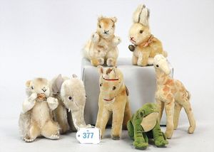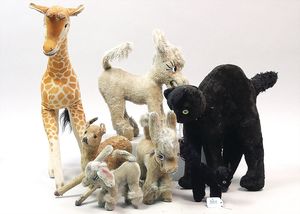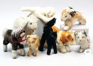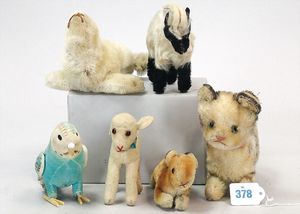 STEIFF Konv. 6 Teile, stärker bespielt, ohne Knopf, Katze, Vogel, Ziegenbock, Seelöwe, Schaf, Nagetier