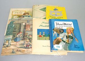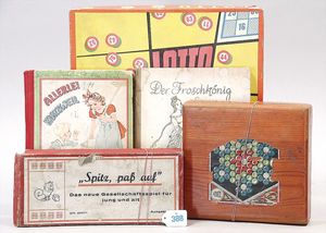 Konv. Kinderspiele, "Spitz, pass auf", nicht komplett, "Kinderlotto", von Klee, "Heckspiel", in Holzkasten, dazu 2 Kinderbücher, "Allerlei Kurzweil" und "Der Froschkönig", mit Bildern von Brünhild Schlötter