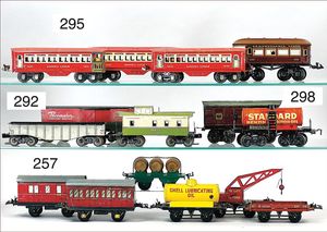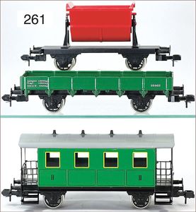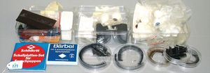 Fundkiste, gr. Konv. Gleismaterial, Spur 0, Stellpult von LGB, einige Teile für eine Blechbahn, MÄRKLIN H0 Oberleitungen, Traktor-Dachabdeckungen, MÄRKLIN-Miniatur-Eisenbahnkatalog Spur 00