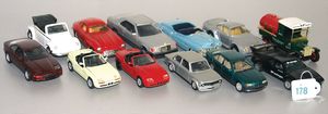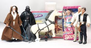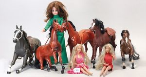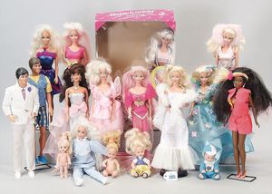 großes Konv., 18 Barbie-Puppen und Ken, diverse Kleidung, Schuhe, dazu 8 kleine Puppen-Ständer, bespielt, in gutem Zust.