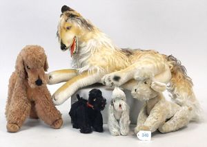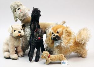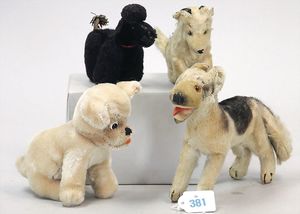 STEIFF Konv. 4 Hunde, Mops, 2 Schäferhunde, Pudel, kl. Ausführung, stärker bespielt, 1 Schäferhund mit Knopf