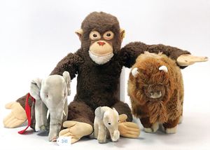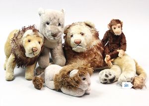 STEIFF 4 Löwen, Affe, stärker bespielt, versch. Größen, teilw. mit Knopf