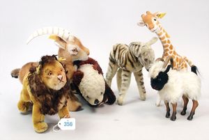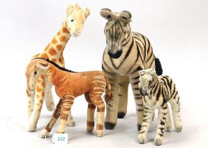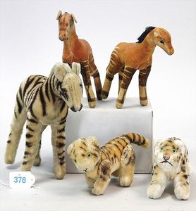 STEIFF Konv. 5 Teile, 2 Okapi, Tiger, Leopard, Zebra, alles stärker bespielt, ohne Knopf, Schild und Fahne