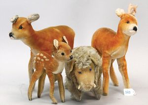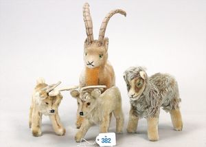 STEIFF Konv. 4 Tiere, stärker bespielt, Steinbock, 2 Renntiere, Ziege, Hörner fehlen teilw.