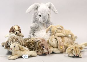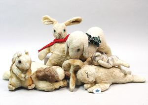 STEIFF Konv. 7 Plüschhasen, davon 3 x Schlafhase, alles stärker bespielt, ohne Knopf, Schild und Fahne
