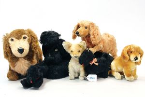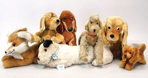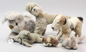 STEIFF Konv. 7 Plüschtiere, 6 Hunde, Fuchs, alles stärker bespielt, teilw. mit Knopf
