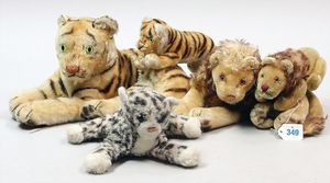 STEIFF 5 Löwen und Tiger, stark bespielt, ohne Knopf, Schild und Fahne