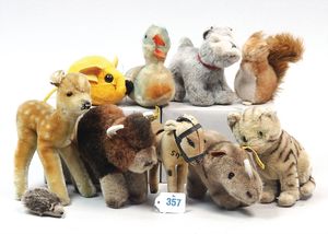 STEIFF Konv. 10 kl. Tiere, alte und neue, teilw. mit Knopf und Fahne