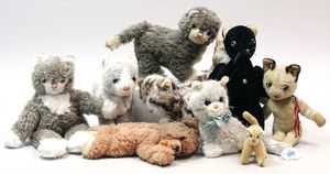 Konv. Plüschkatzen, STEIFF und GRISLY, stärker bespielt, teilw. mit Knopf
