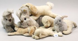 STEIFF Konv. 6 Plüschtiere, Lamm, 3 Schlafhasen, Schlafhund, Eichhörnchen, alles stärker bespielt, teilw. mit Knopf