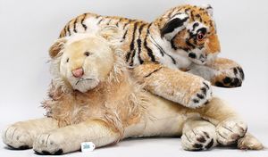 STEIFF 2 Plüschtiere, 1 x Löwe, liegend, stark bespielt, ohne Knopf, Schild und Fahne, ca. 60 cm, 1 x Tiger Pascha, mit Knopf, Schild und Fahne, weich gestopft, 50 cm
