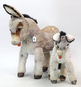 STEIFF 2 Esel, 1 x mit Knopf, Stehhöhe 35 cm, 1 x ohne Knopf, Schild und Fahne, Stehhöhe 50 cm, beide stärker bespielt