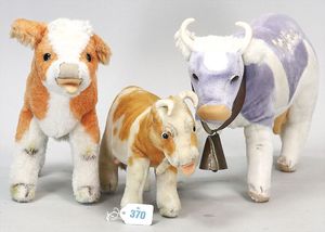 3 Plüschkühe, 1 x STEIFF mit Knopf und Fahne, Nr. 5180/28, 1 x Ohren fehlen, 1 x Milka Kuh mit Glocke