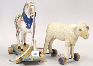 Wollschaf auf Holzrädern, wohl STEIFF, Stehhöhe ca. 20 cm, dazu Holzpferd auf Rädern, bemalt, stark bespielt