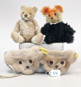 STEIFF 4 Teile, kl. Maskenbär, ohne Knopf, 1 x Bär Hersteller?, 2 STEIFF Bären-Täschchen, mit Knopf und Fahne