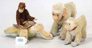 STEIFF Konv. 4 Teile, stärker bespielt, 3 kl. Affen, 1 x mit Knopf und Teilfahne, 1 x Schildkröte Slo, ohne Knopf, Schild und Fahne