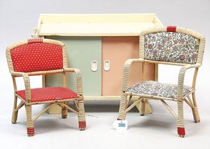 50er Jahre Wickelkommode, Höhe 23 cm, Holz lackiert, dazu 2 Korbsessel