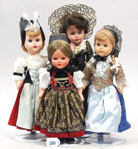 Konv. 4 Trachtenpuppen, Kunststoff, Hersteller ?, Kunsthaar-Perücken, ca. 30 cm, mit schön gearbeiteten Trachten