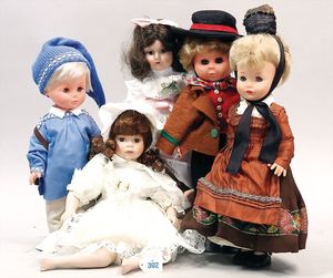 Konv. 5 Puppen, 3 x Vinyl, in Tracht und 2 x Porzellankopf-Arme und -Beine, Körper Stoff, weich gestopft, Kunsthaar-Perücken