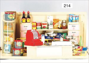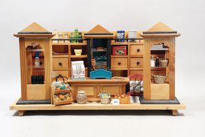 Kaufladen, Holz, Eigenbau, neu, Länge 78 cm, Tiefe 40 cm, Höhe 35 cm, mit 2 aufklappbaren Schaufenstern, Schubladen, Theke, dazu reichh. Zubehör, Kaufladenwaage, Kasse, Bonbongläser, u.v.m., bitte besichtigen