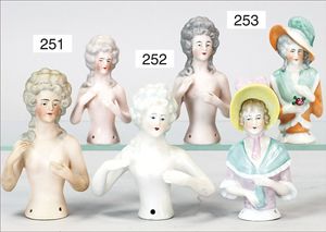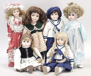 Konv. 6 Porzellan-Puppen, neu, Stoffkörper, weich gestopft, Hersteller ?, ca. 38 cm