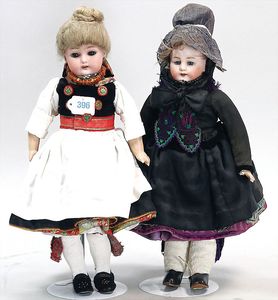 SIMON & HALBIG 2 Porzellankopf-Puppen, braune und blaue Schlafaugen, off. Mund, Zähne, Mohairperücke aufgeklebt, 1 einfacher Stoffkörper, 36 cm, 1 x mit Holz-Masse-Körper, 36 cm, beide in Tracht