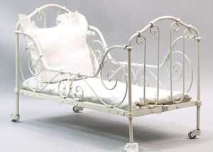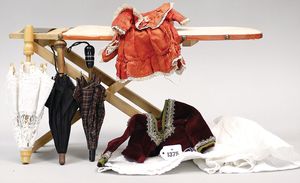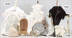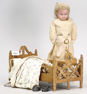 Puppenbett, Laubsägearbeit, 31 cm, 1 Seite gebrochen, dazu 1 Wachs-Brustblattkopf-Puppe, 34 cm, Kopf gebrochen, blaue fest eingesetzte Glasaugen, Masse-Stehkörper, alte Kleidung, dazu einige Kleidungsstücke