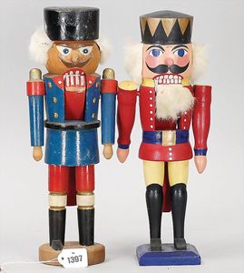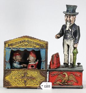 2 Teile Guss-Spardosen, Oncle Sam Bank, Mann mit Zylinder, Tasche und Schirm, 28 cm, dazu 1 Kasperl-Theater, 15 cm, Alter?
